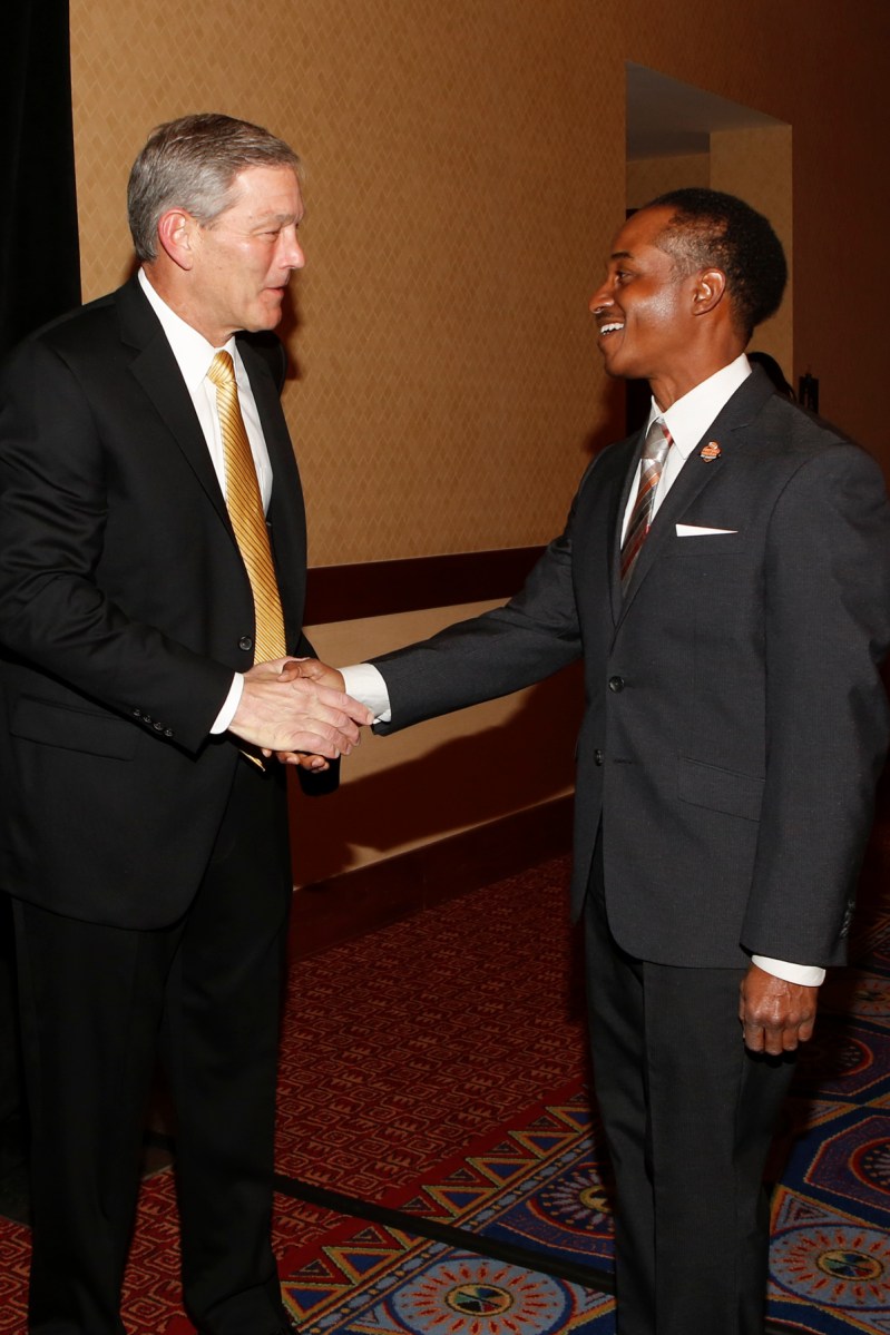 00015eddie robinson award 010916 Published January 18, 2016 at 1199 × 1800 Iowa Coach Kirk Ferentz, winner of the Eddie Robinson Coach of the Year Award, shakes hands with Eddie Robinson III, grandson of the award’s namesake, at a reception on Jan. 9 in Scottsdale, Ariz. Photo by Melissa Macatee.