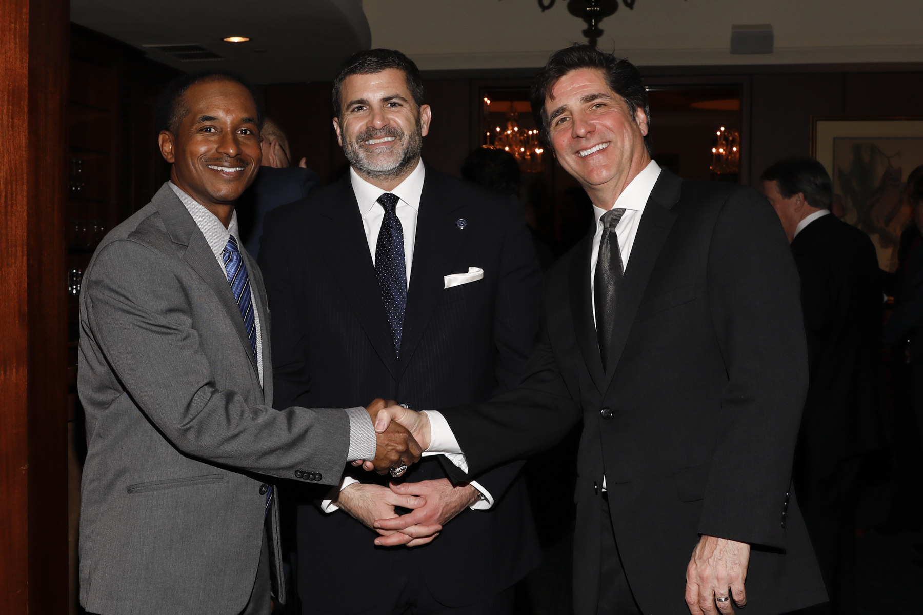 00038FWAA Past Presidents dinner 010518 Published January 15, 2018 at 1800 × 1199 Left to right, Eddie Robinson III, Matt Sign of the National Football Foundation and Dennis Adamovich of the College Football Hall of Fame. Photo by Melissa Macatee.