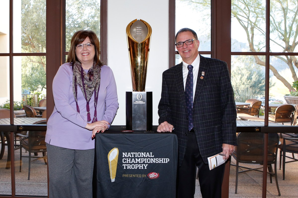 00046fwaa breakfast 011116A Published January 19, 2016 at 3000 × 2001 2015 FWAA President Lee Barfknecht and his wife, Sara, pose with the CFP national championship trophy at the FWAA’s annual Awards Breakfast on Jan. 11, 2016, in Scottsdale, Ariz. Photo by Melissa Macatee.