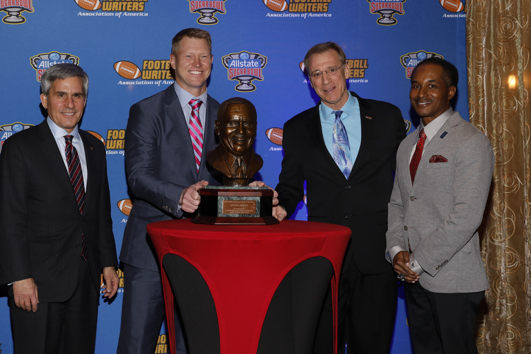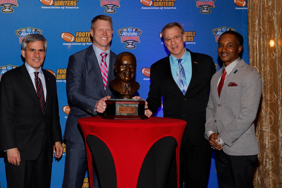 00095eddie robinson award 010618 Published January 15, 2018 at 1800 × 1200 Left to right, Stanley Cohn (Sugar Bowl), Coach of the Year Scott Frost, 2017 FWAA President Dave Jones and Eddie Robinson III. Photo by Melissa Macatee.