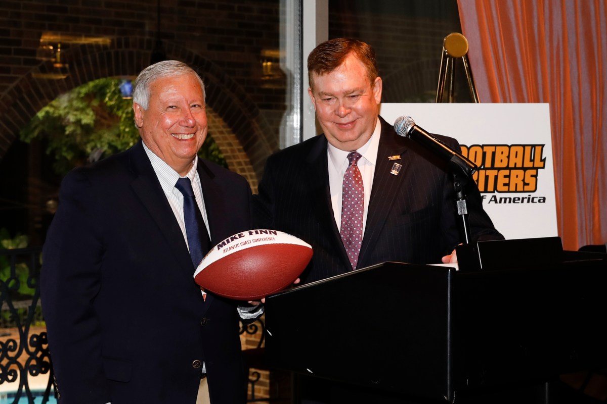 00107FWAA awards breakfast 010817 Published January 15, 2018 at 1800 × 1201 FWAA Past President Tony Barnhart presents the FWAA’s Lifetime Achievement Award to Mike Finn of the ACC. Photo by Melissa Macatee.