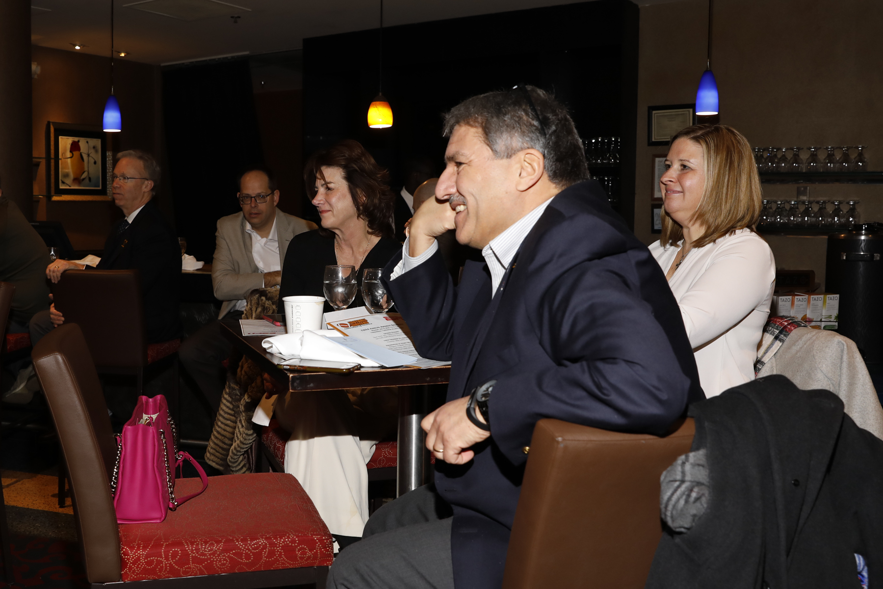 00117FWAA awards breakfast 010817 Published January 15, 2018 at 1800 × 1200 Tom Odjakjian of the American Athletic Conference enjoys a light moment during the awards breakfast. Photo by Melissa Macatee.