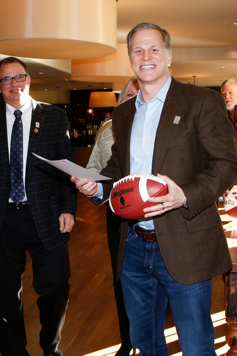 00149fwaa breakfast 011116 Published January 19, 2016 at 2000 × 3000 Ted Miller of ESPN.com accepted a commemorative football and certificate for first place in the column category of the FWAA’s 2015 Best Writing Contest. Photo by Melissa Macatee.