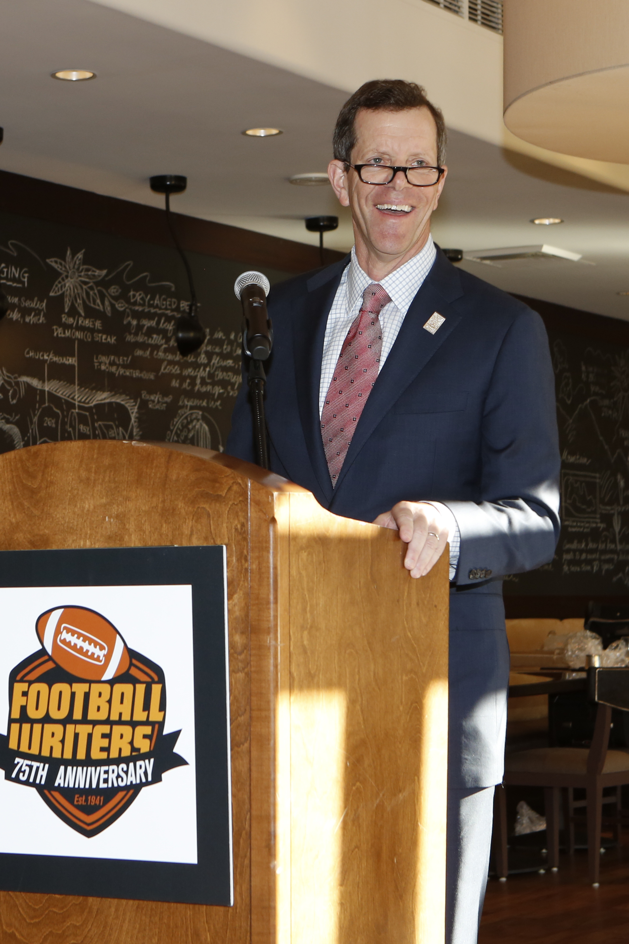00250fwaa breakfast 011116 Published January 19, 2016 at 1999 × 3000 Ivan Maisel of ESPN.com addresses the membership after receiving the FWAA’s Bert McGrane Award on Jan. 11, 2016. Photo by Melissa Macatee.