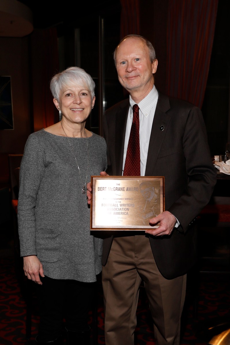 00255FWAA awards breakfast 010817 Published January 15, 2018 at 1199 × 1800 Bert McGrane Award winner Steve Wieberg and his wife, Paula. Photo by Melissa Macatee.