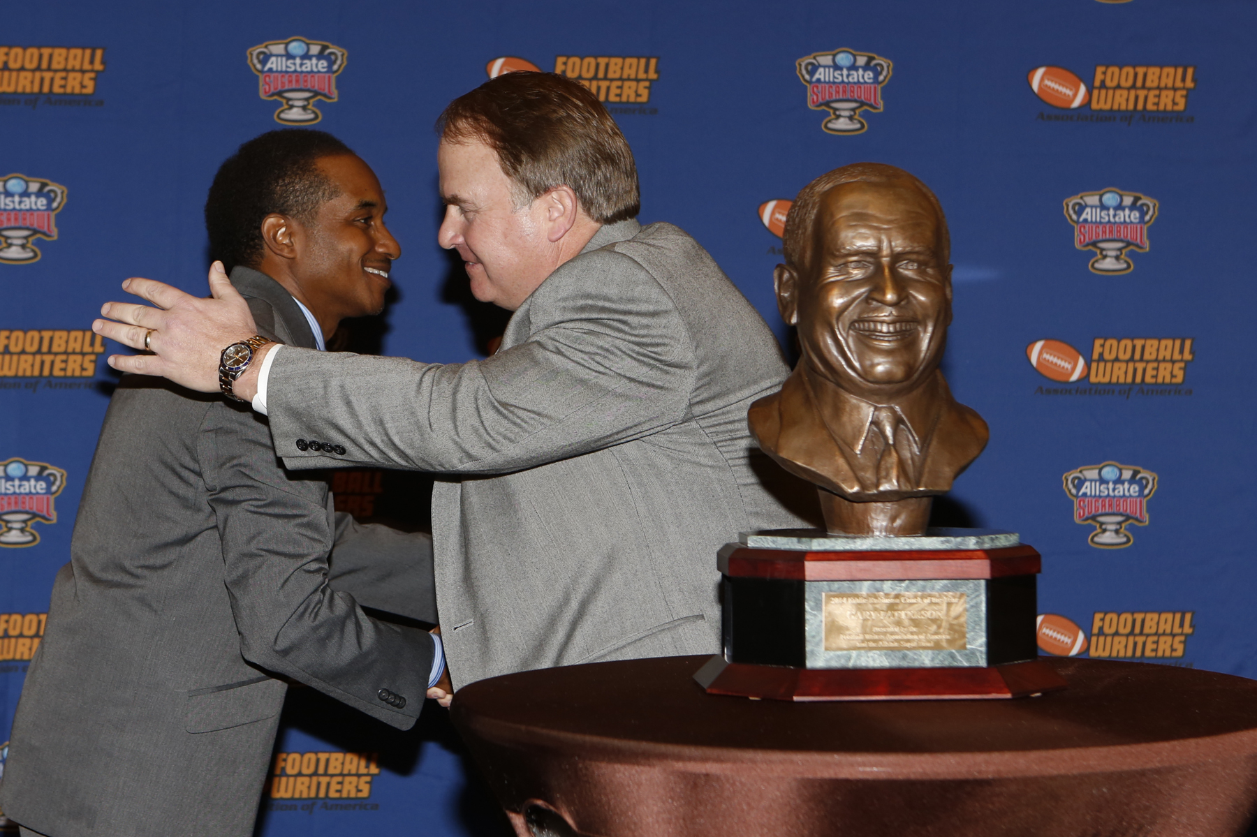 0064FWAA_Robinson dinner 011015 Published January 17, 2015 at 1800 × 1199 Coach of the Year Gary Patterson of TCU accepts congratulations from Eddie Robinson III. (Melissa Macatee photo)