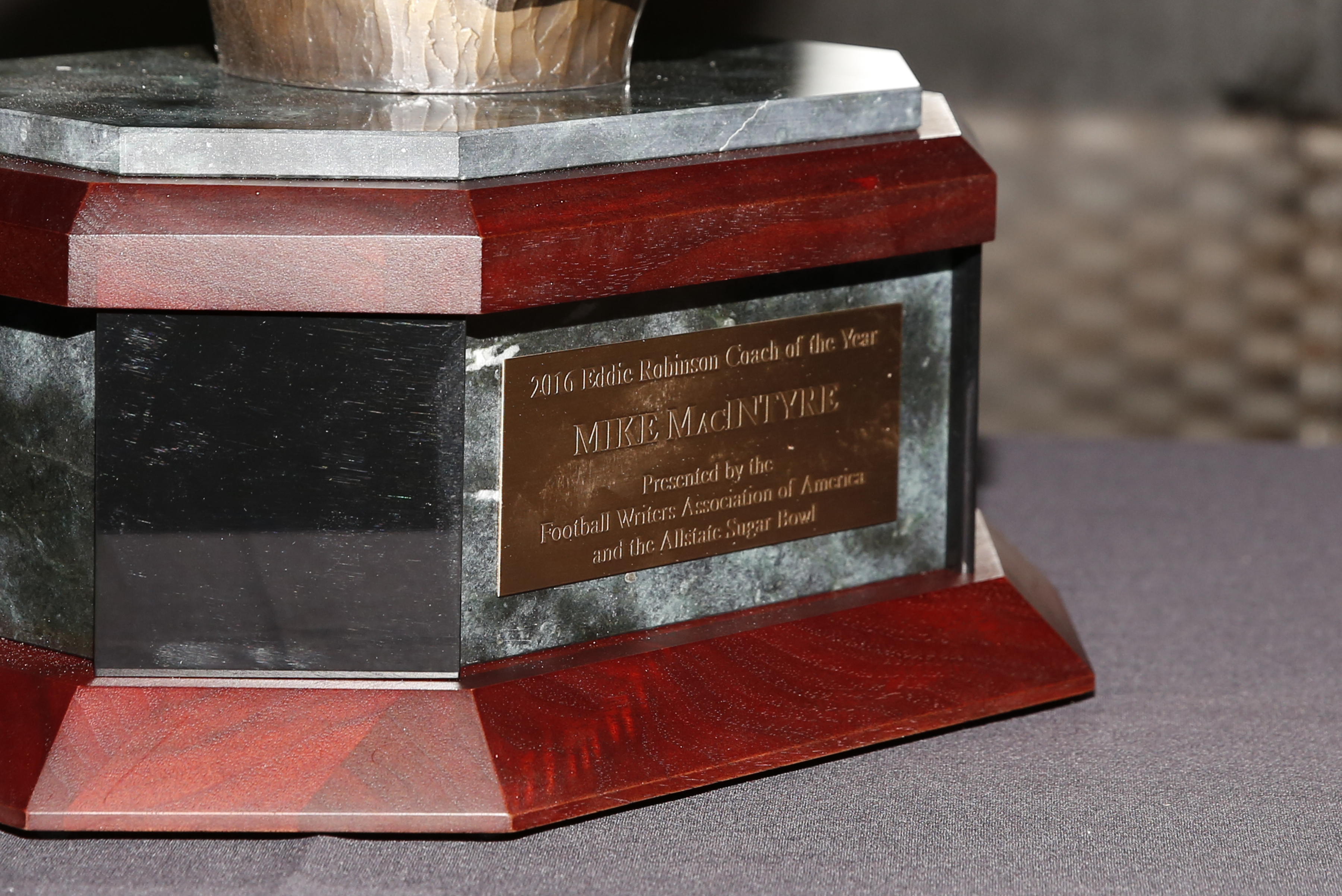 150_eddie Published January 20, 2017 at 3600 × 2404 The base of the FWAA Eddie Robinson Coach of the Year Award, bearing the name of the 2016 winner, Colorado Coach Mike MacIntyre. Photo by Melissa Macatee.