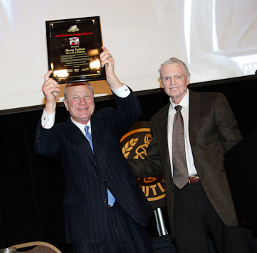 165_mg_2004 Published January 27, 2017 at 361 × 356 Former Oklahoma Coach Barry Switzer, with former Nebraska Coach Tom Osborne, hoists his Tom Osborne Legacy Award during the Outland Trophy Presentation Banquet on Jan. 11, 2017, in Omaha. Photo by C41 Photography.