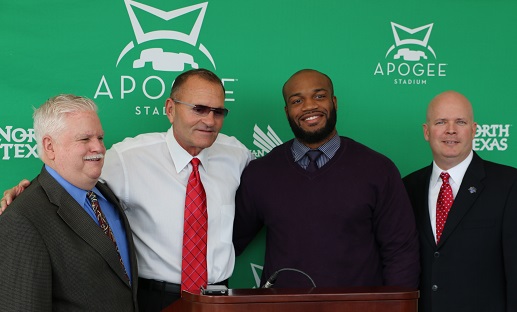2013 Armed Forces Merit Award winner Brandon McCoy of North Texas (second from right) is pictured with (left to right) FWAA Executive Director Steve Richardson, North Texas coach Dan McCarney and Brant Ringler, executive director of the Bell Helicopter Armed Forces Bowl.