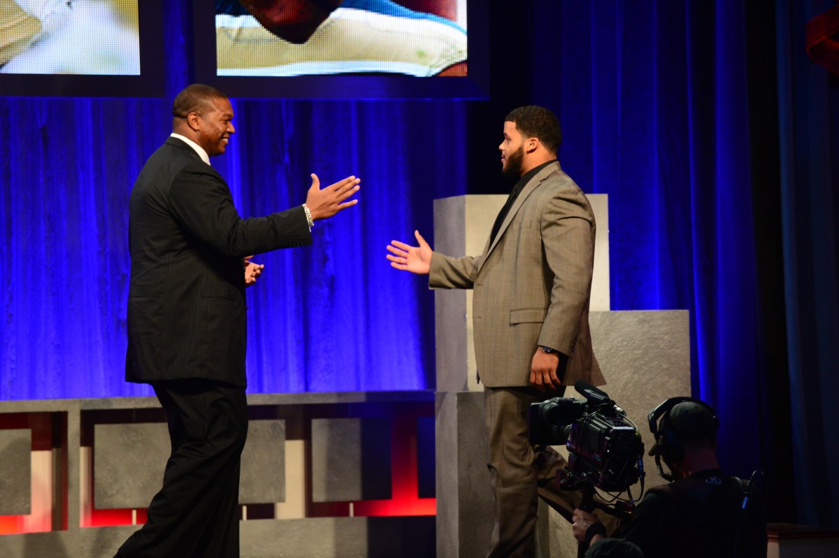Aaron Donald (right), the 2013 Outland Trophy winner, is congratulated by Chris Samuels, the 1999 Outland Trophy winner. Photo courtesy of ESPN.