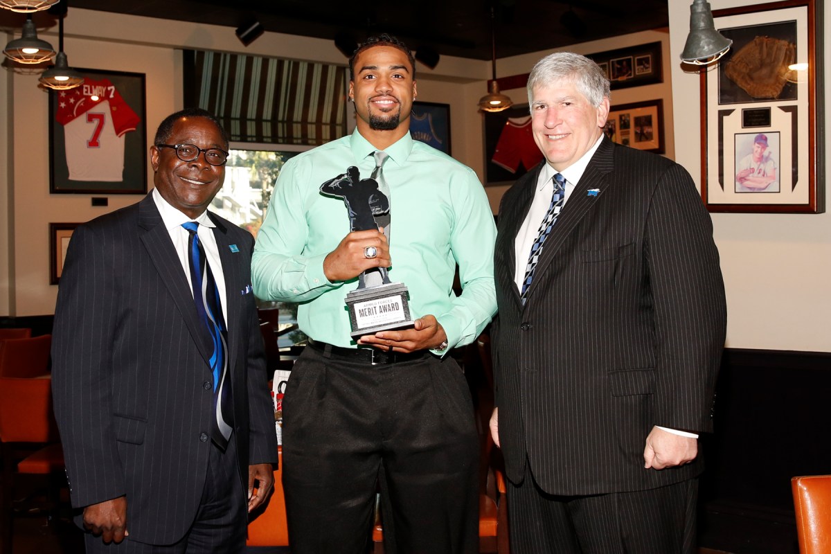 Armed Forces Merit Award winner Steven Rhodes, a former Marine and defensive end at Middle Tennessee State, is flanked by