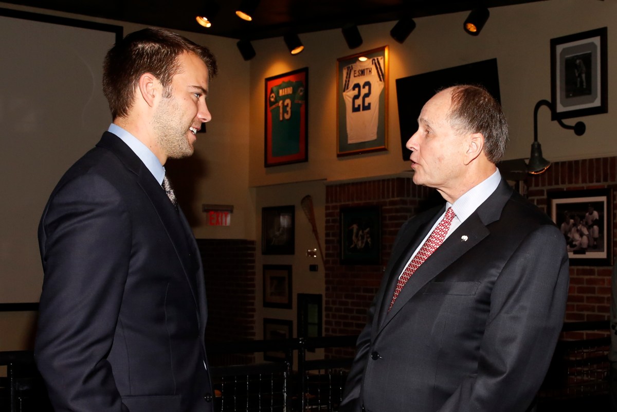 Zach Terrell, Western Michigan quarterback and winner of the Campbell Trophy, talks with Charlie Fiss, winner of the 2017 Bert McGrane Award, at the FWAA’s Awards Breakfast on Jan. 9, 2017, in Tampa. They got to know each other earlier when Western Michigan came to Dallas to play Wisconsin in the Cotton Bowl, for which Fiss works as vice president of communications. Photo by Melissa Macatee.