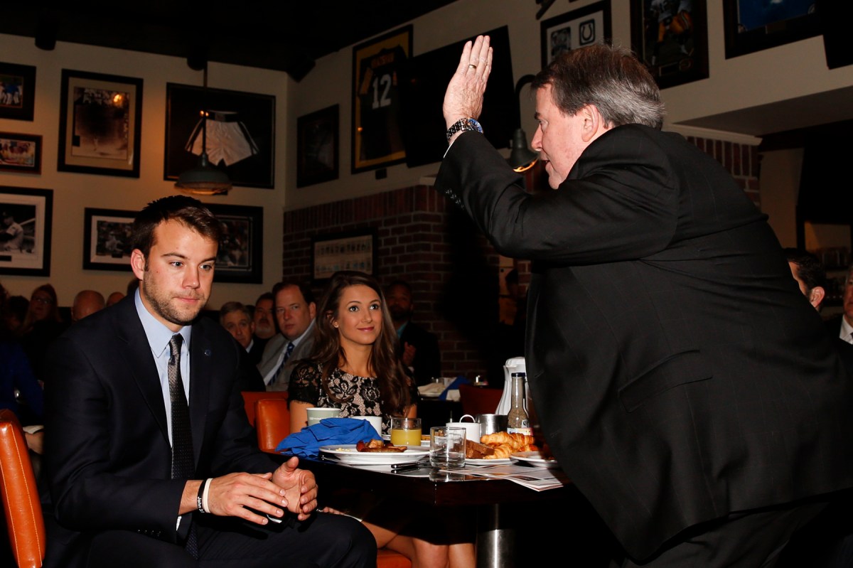 Steve Hatchell, president and CEO of the National Football Foundation, acknowledges the audience at the FWAA Awards Breakfast on Jan. 9, 2017. At left is Zach Terrell, quarterback at Western Michigan and winner of the NFF’s Campbell Trophy, which goes to the top scholar athlete in college football. Photo by Melissa Macatee.