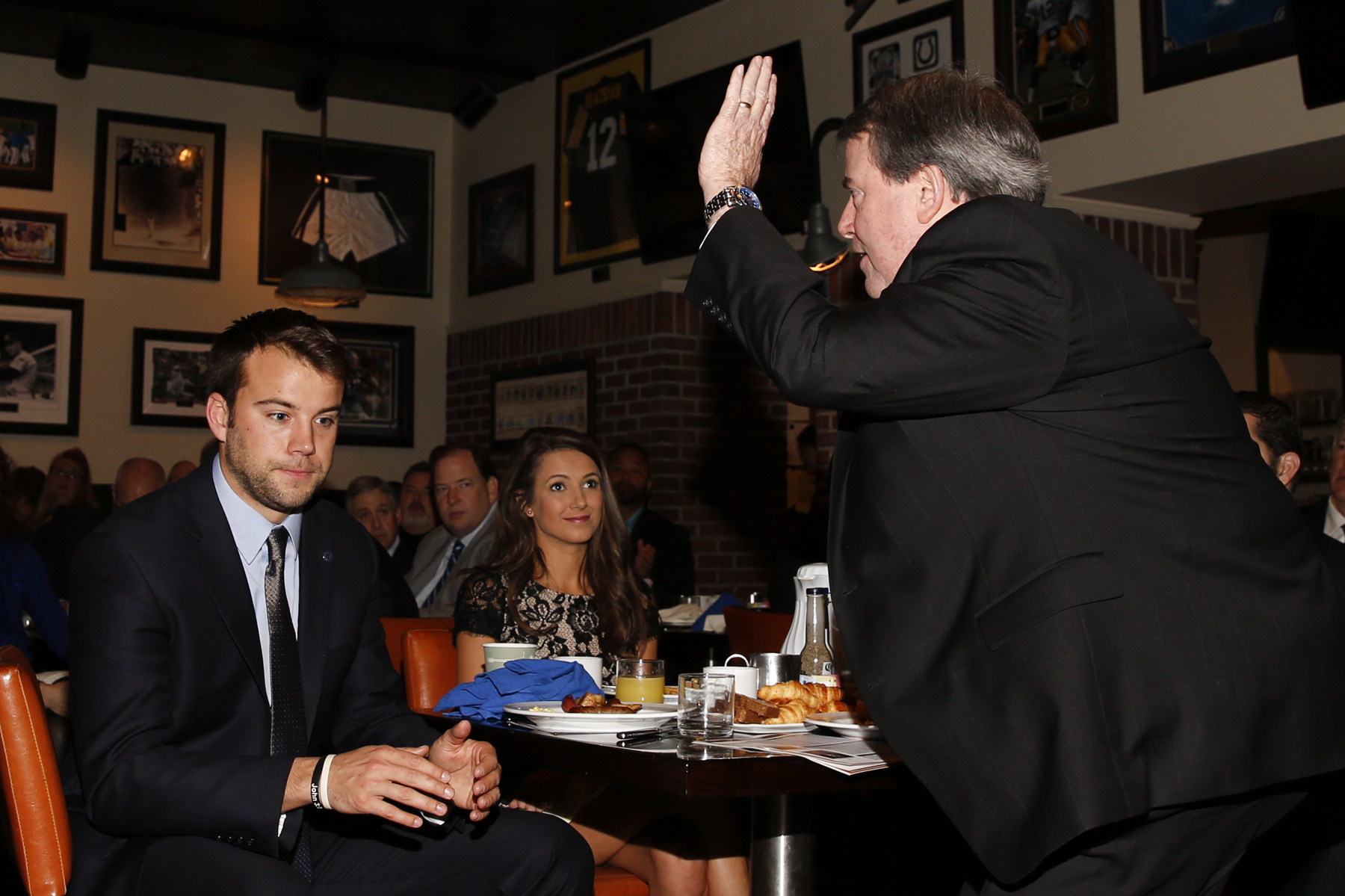 Steve Hatchell, president and CEO of the National Football Foundation, acknowledges the audience at the FWAA Awards Breakfast on Jan. 9, 2017. At left is Zach Terrell, quarterback at Western Michigan and winner of the NFF’s Campbell Trophy, which goes to the top scholar athlete in college football. Photo by Melissa Macatee.