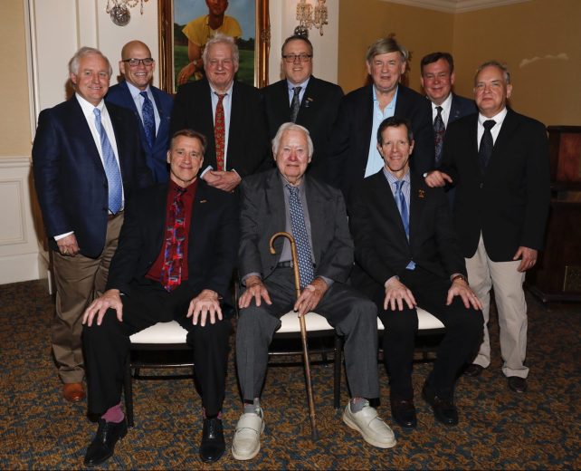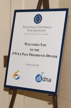 The FWAA Past Presidents’ Dinner, hosted by the National Football Foundation, was at the Capital City Club in Atlanta on Jan. 5. Past presidents in attendance were, back row, left to right, Kirk Bohls, Dennis Dodd, Mark Blaudchun, Chris Dufresne, Dick Weiss, Tony Barnhart, Tim Griffin. Front Row, left to right, Dave Jones. Bill Lumpkin, Ivan Maisel.