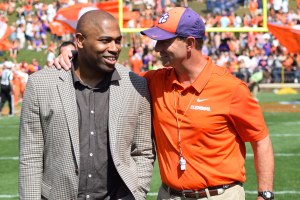 CLEMSON, S.C. — Dabo Swinney was having flashbacks during the Clemson spring football game on Saturday with former Alabama and Seattle Seahawks star Shaun Alexander in attendance.