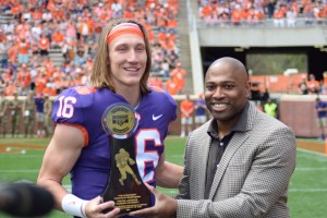 Former Alabama and NFL running back Shaun Alexander presents the inaugural Shaun Alexander/FWAA Freshman of the Year Trophy to Clemson quarterback Trevor Lawrence. The formal presentation occurred at Cloemson’s 2019 spring game. Photo by Shane Sandefur.