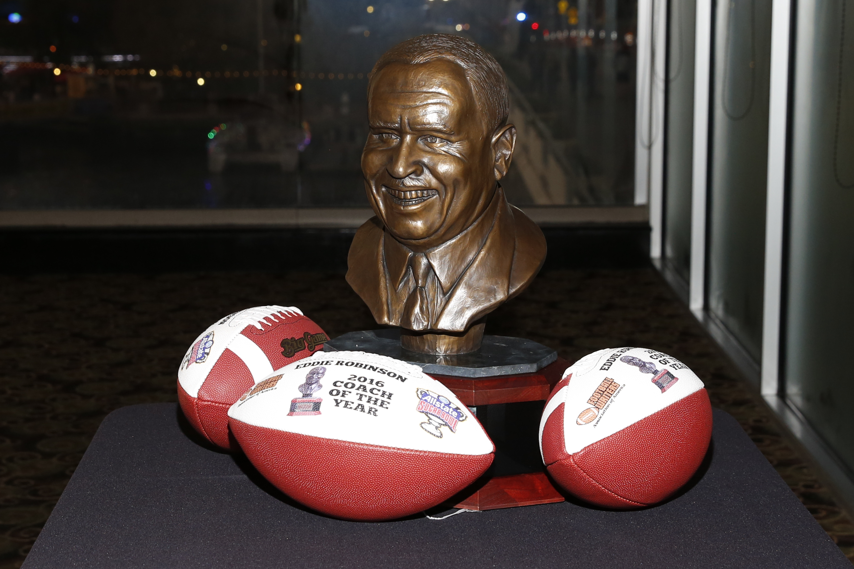 30eddie Published January 19, 2017 at 3600 × 2399 The FWAA Eddie Robinson Coach of the Year Award and commemorative footballs. Photo by Melissa Macatee.