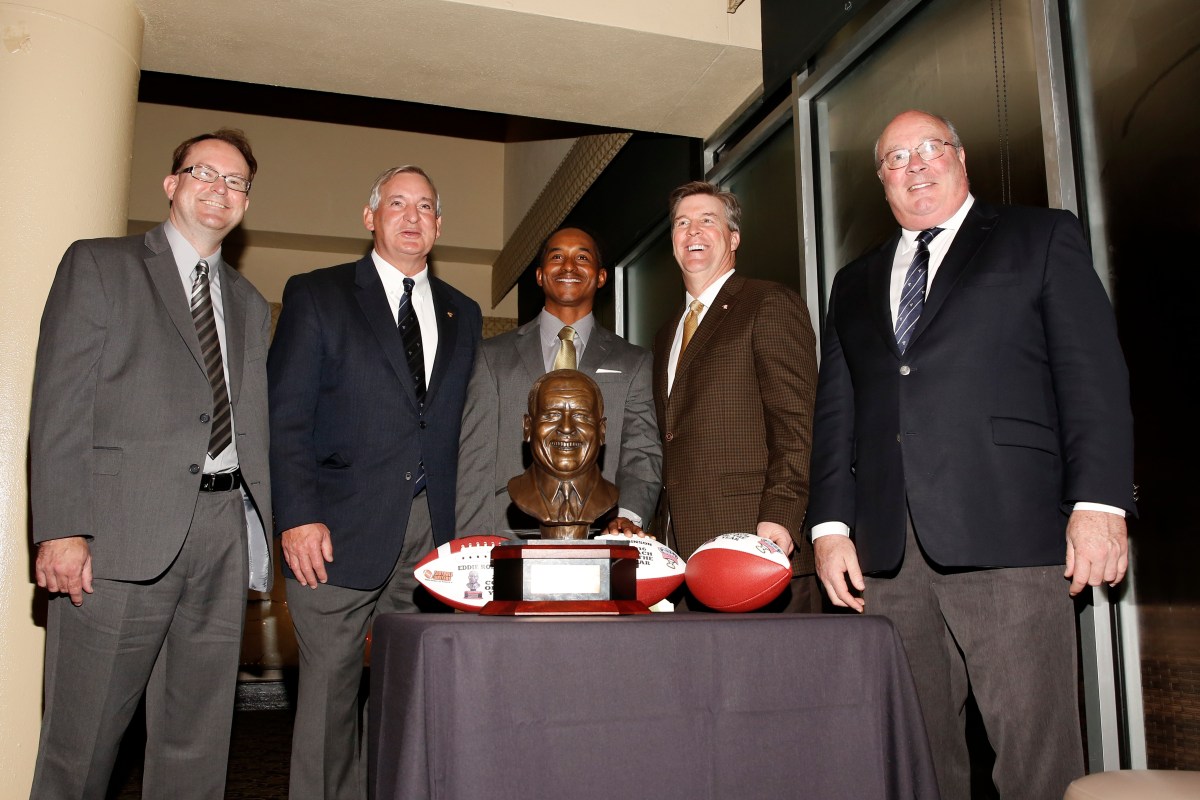 Left to right: 2016 FWAA President Mark Anderson, Allstate Sugar Bowl President Chuck Lapeyre, Eddie Robinson III, Colorado Coach Mike MacIntyre, winner of the FWAA Eddie Robinson Coach of the Year Award, and Paul Hoolahan of the Sugar Bowl on Jan. 7, 2017, in Tampa. Photo by Melissa Macatee.