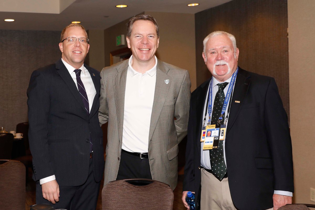 breakfast6 Published January 21, 2019 at 3600 × 2398 ((L-R) John McElwain of the Sun Belt Conference, Ken Mather of the Mid-American Conference and Doug Kelley of the Football Bowl Association. Kelly is a current FWAA Board Member. (Photo by Melissa Macatee)