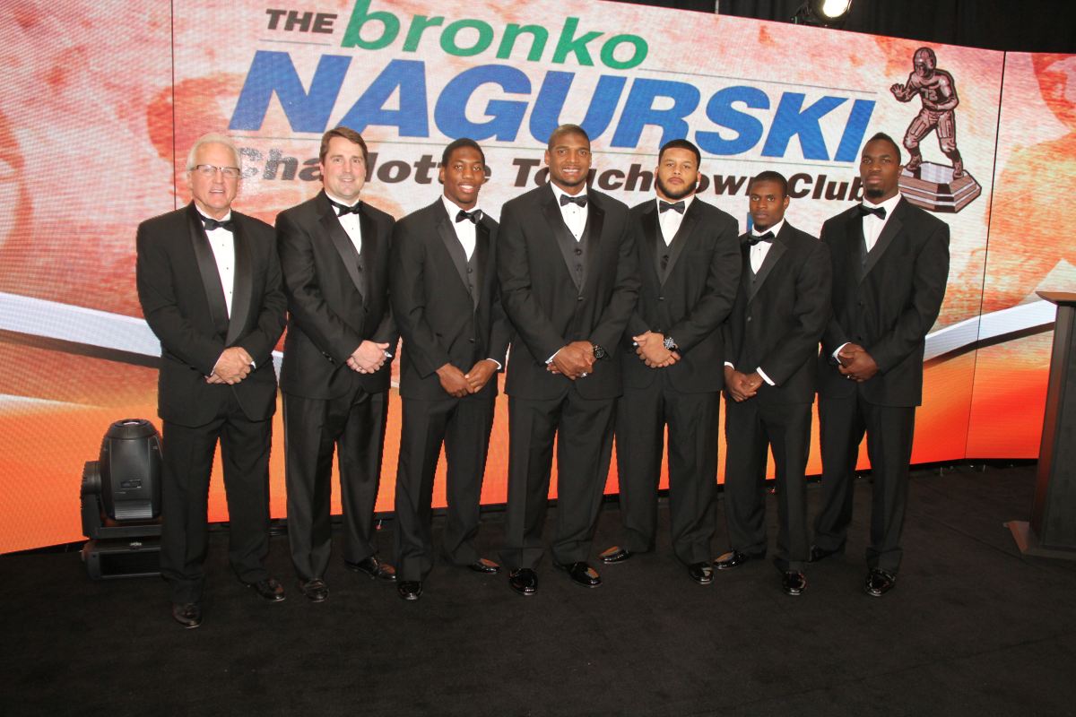 Bronko Nagurksi Award: left to right: Randy Rhino of Georgia Tech, Bronko Nagurski Legends Winner, Florida coach Will Muschamp, and the five 2013 Bronko Nagurski finalists; Darqueze Dennard of Michigan State, Michael Sam of Missouri, Aaron Donald of Pittsburgh, Lamarcus Joyner of Florida State and C.J. Mosley of Alabama. Photo by Ron J.Deshaies/Treasured Events of Charlotte.