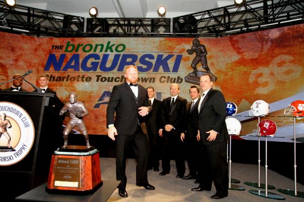 Bronko Nagurski Day 12-7-2015 1900 Published January 6, 2016 at 600 × 399 Temple linebacker Tyler Matakevich steps forward to accept the Bronko Nagurski Trophy after being named the 2015 winner by FWAA President Lee Barfknect (right). Photo by Ron J.Deshaies/Treasured Events of Charlotte.