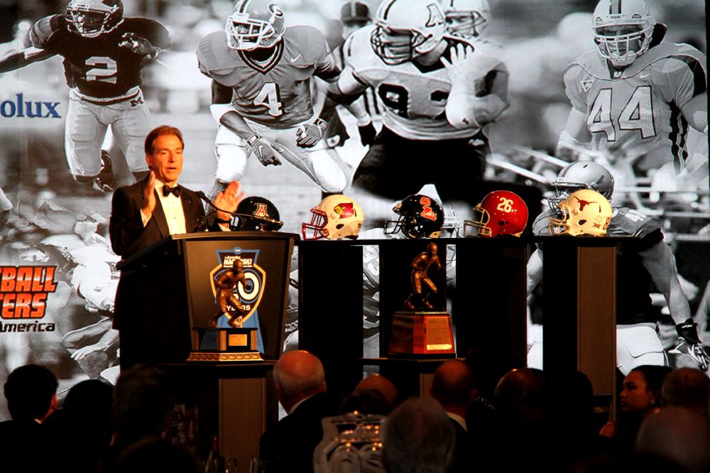 Bronko Nagurski Trophy 12-8-2014 1989 Published December 9, 2014 at 1000 × 666 Alabama coach Nick Saban gave the keynote address at the 2014 Bronko Nagurski Banquet. (Photo by Ron & Donna Deshaies/Treasured Events of Charlotte.)