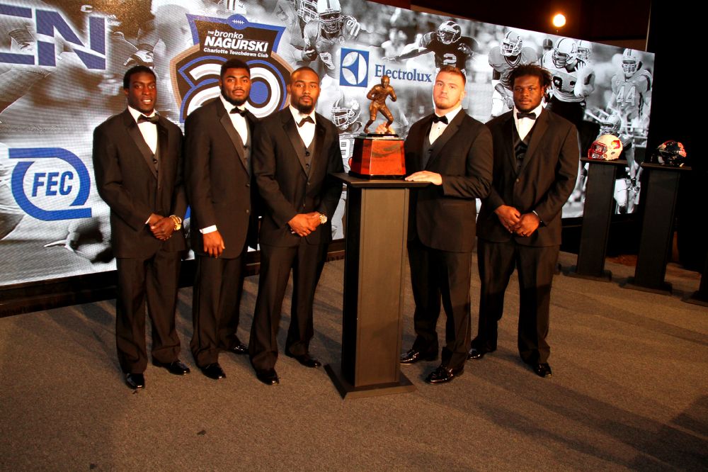 The five finalists for the 2014 Bronko Nagurski Trophy (from left to right): Ole Miss’ Senquez Golson, Alabama’s Landon Collins, Louisville’s Gerod Holliman, Arizona’s Scooby Wright III and Texas’ Malcom Brown. (Photo by Ron & Donna Deshaies/Treasured Events of Charlotte.)