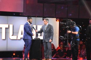 Ed Oliver of the University of Houston is interviewed by ESPN’s Chris Fowler after receiving the 2017 Outland Trophy at the College Football Awards Show. Photo by Andy Crawford.