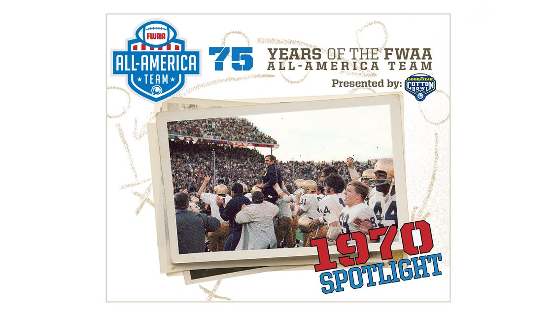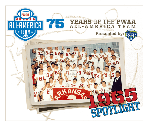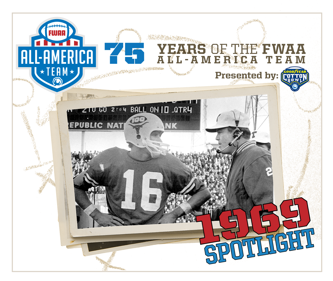 (Ed. Note: This is the seventh in the series of digital postcards commemorating 75 years of the FWAA All-America Team. The first FWAA All-America Team was published in 1944 during World War II and is the second longest continuously published team in major-college football.)