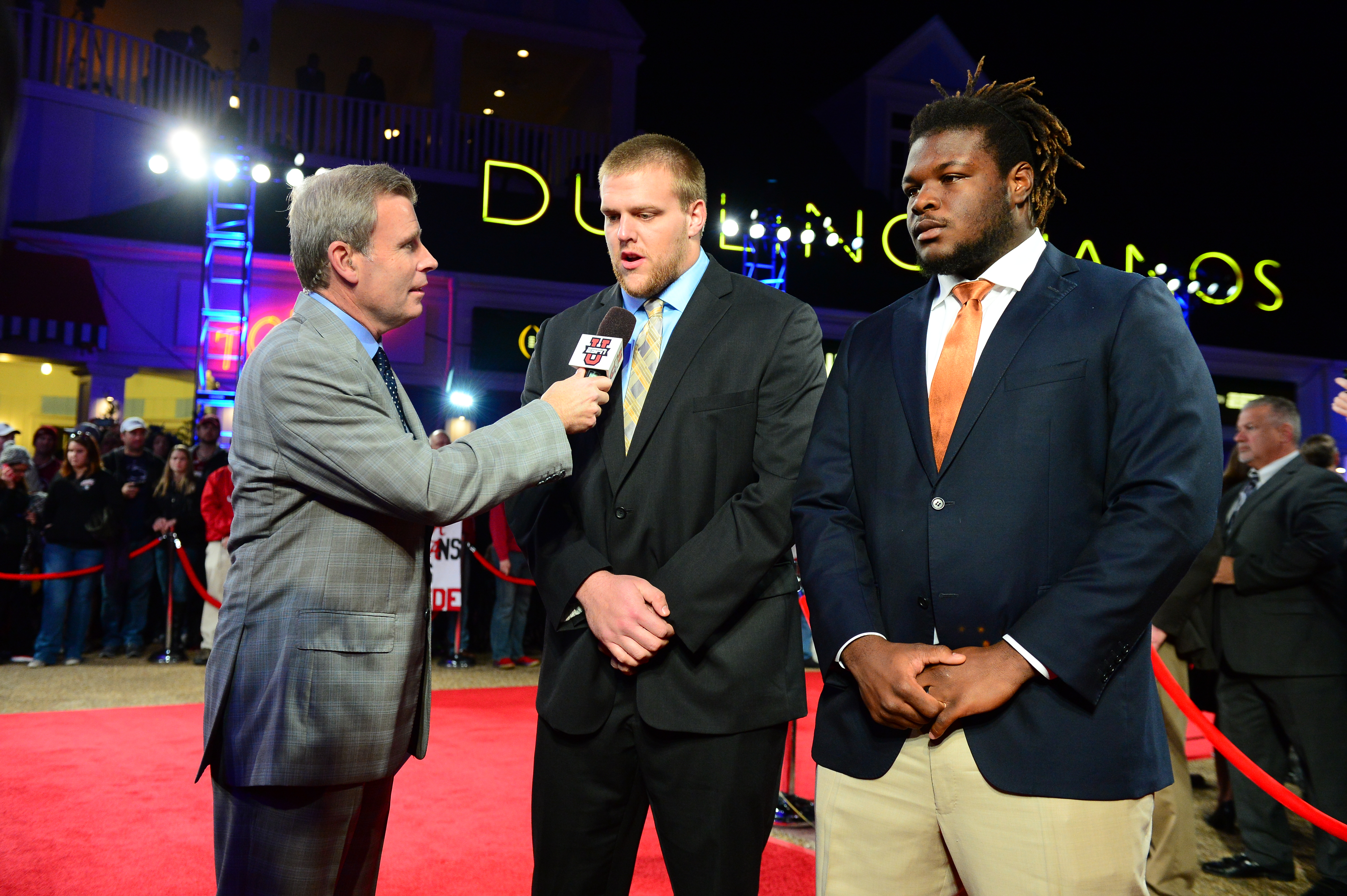 Brandon Scherff of Iowa and Malcom Brown of Texas being interviewed on the Red Carpet Show. Brown was an Outland finalist.