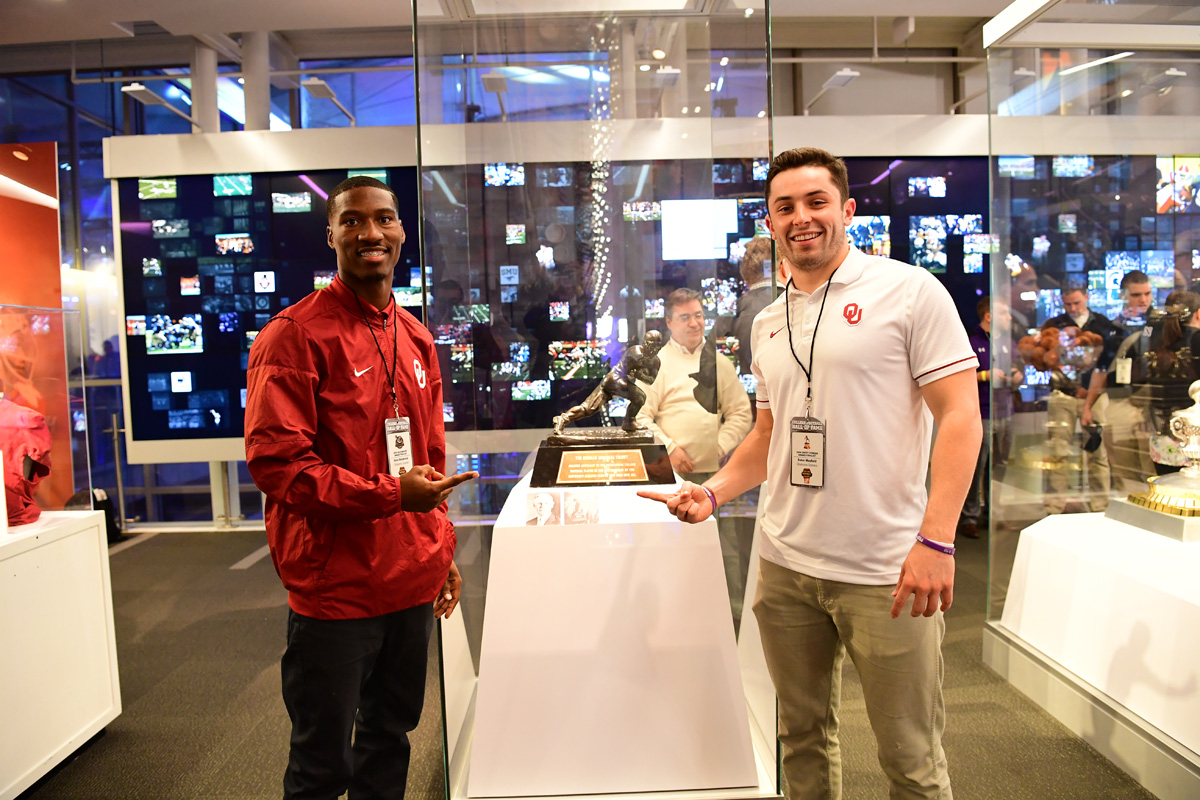 Oklahoma Sooners Dede Westbrook (left)and Baker Mayfield point to each other as they flank the Heisman Trophy. Both were finalists for the Heisman. Westbrook was a first-team wide receiver on the FWAA All-America team, while Mayfield was the second-team quarterback for the second year in a row. (Photo by Phil Ellsworth / ESPN Images)