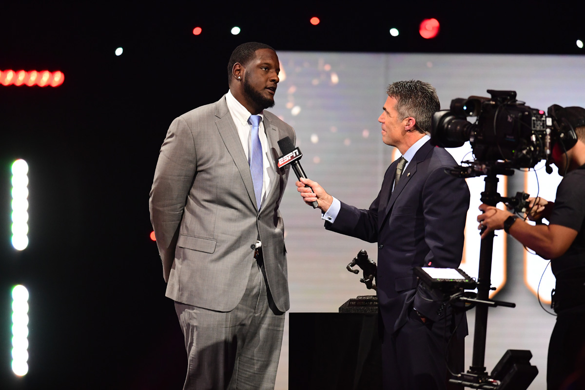 College Football Awards – December 8, 2016 Published December 12, 2016 at 1200 × 800 Alabama offensive tackle Cam Robinson, winner of the 2016 Outland Trophy as the nation’s best interior lineman, is interviewed by ESPN’s Chris Fowler during the Home Depot College Football Awards Show on ESPN. (Photo by Phil Ellsworth / ESPN Images)