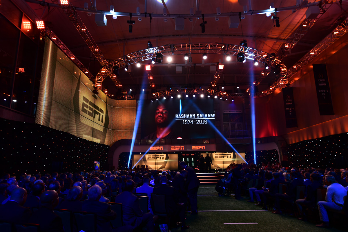 College Football Awards – December 8, 2016 Published December 12, 2016 at 1200 × 800 Former Heisman Trophy winner Rashaan Salaam, who died suddenly in December, is remembered during the College Football Awards Show. (Photo by Phil Ellsworth / ESPN Images)