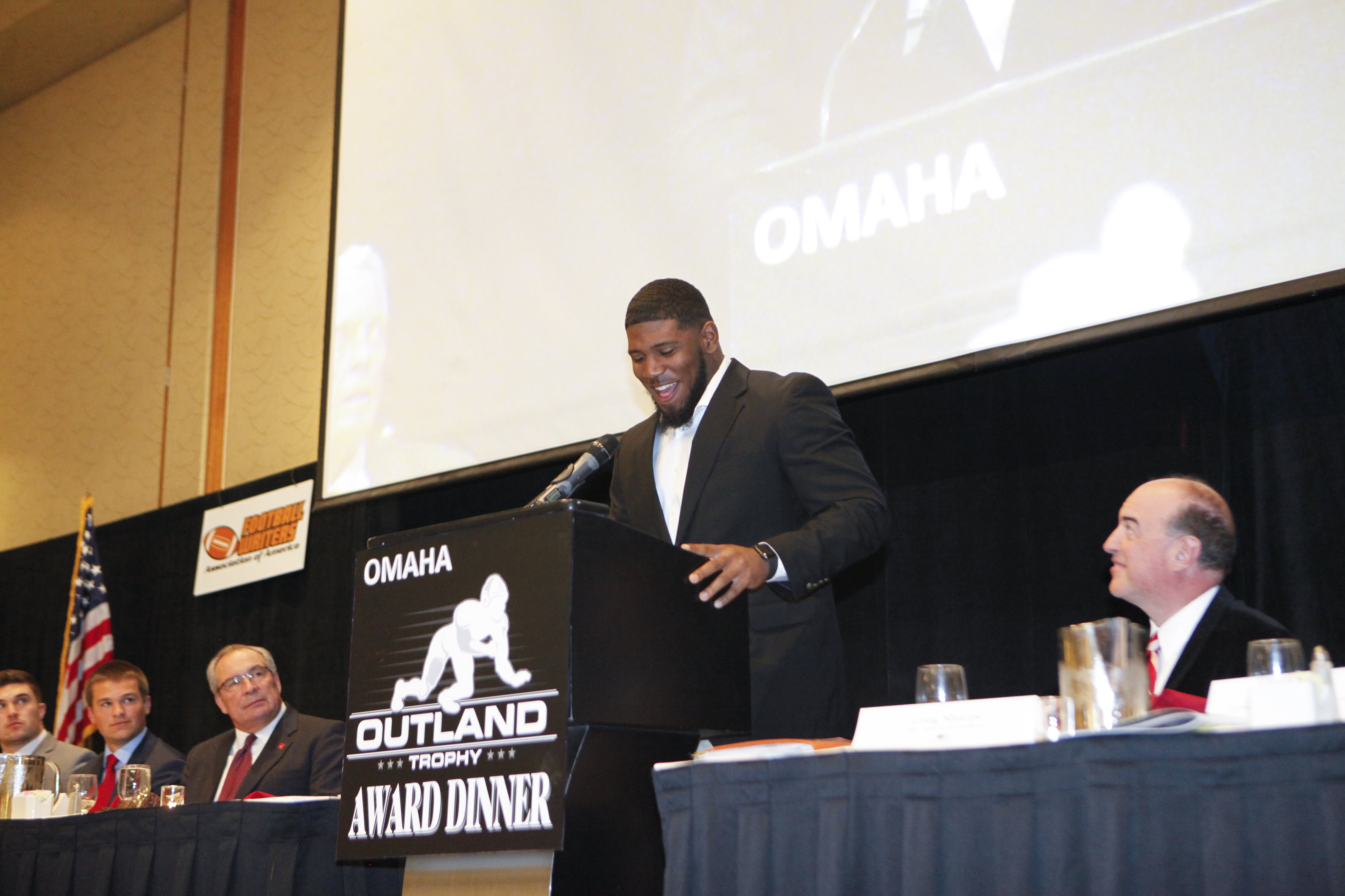 ed oliver smiles Published January 20, 2018 at 4898 × 3265 Outland Trophy winner Ed Oliver of the University of Houston enjoys a laugh during his acceptance speech. C41Photography.