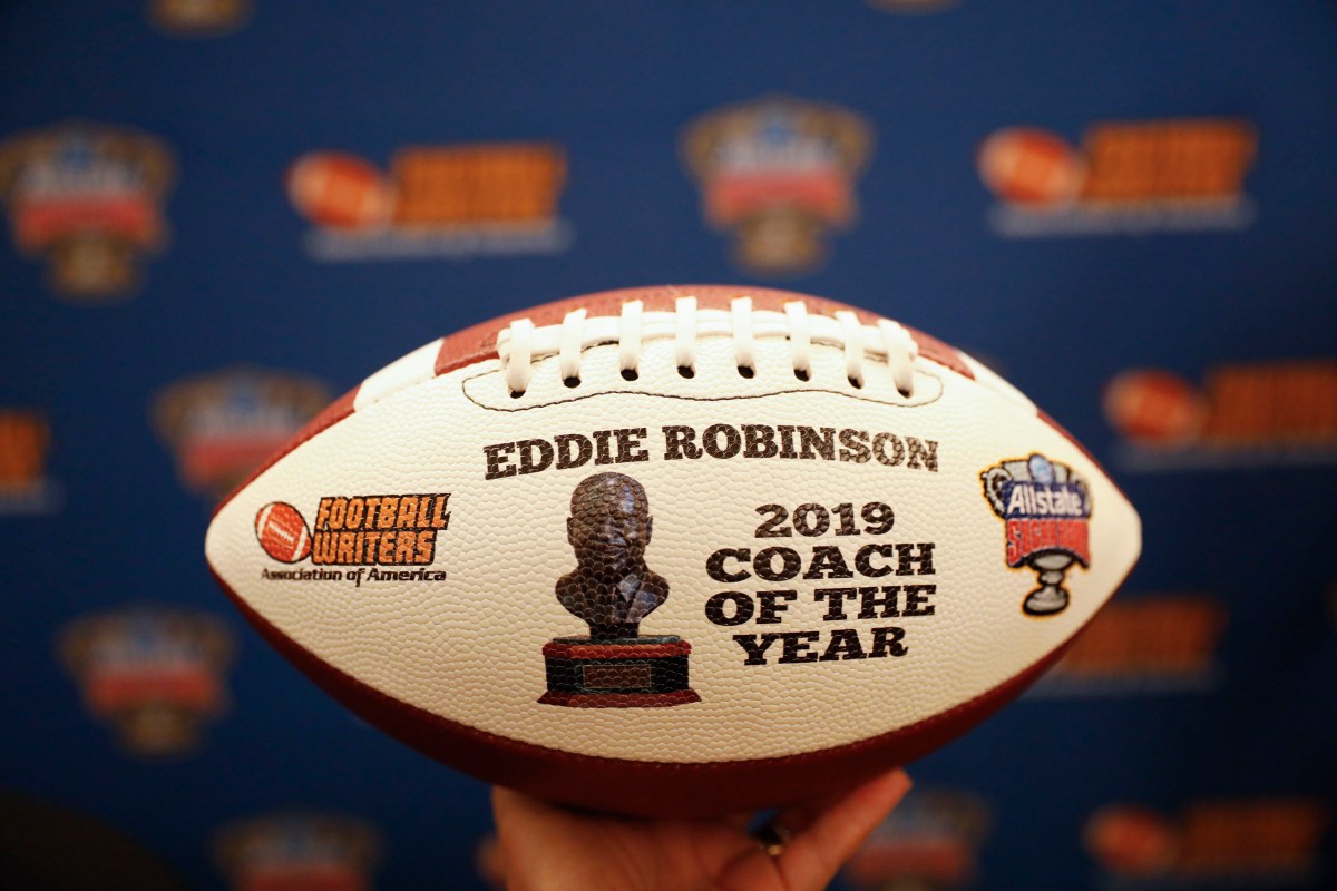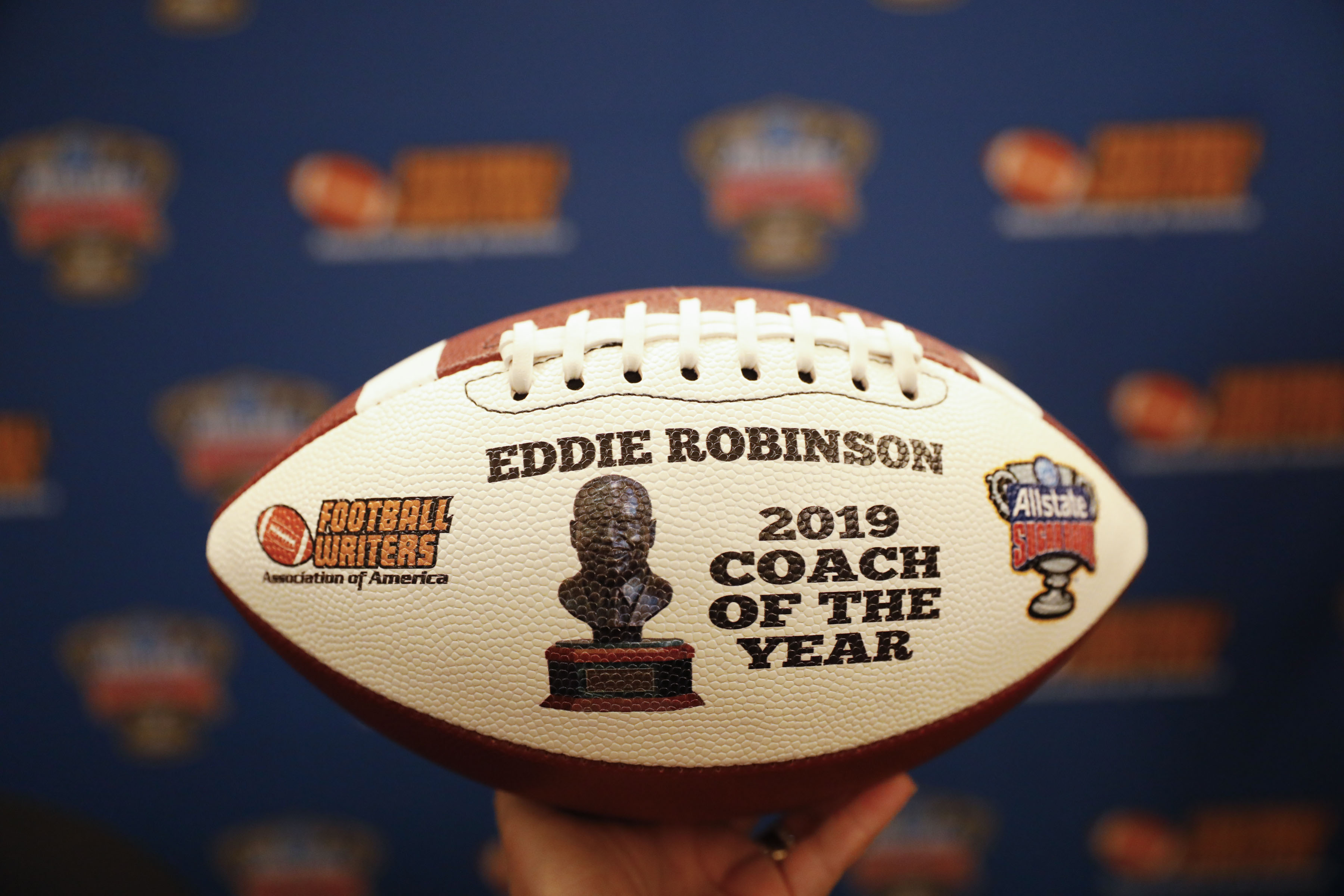 Eddie Robinson presentation 1 Published January 23, 2020 at 3600 × 2400 Commemorative football. (Photo by Melissa Macatee)