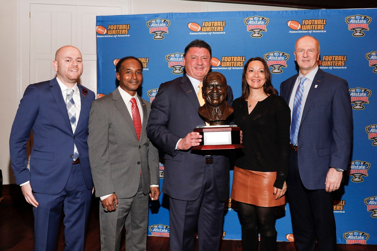 Eddie Robinson presentation 166 Published January 23, 2020 at 3600 × 2400 Left to right, 2019 FWAA President Matt Fortuna, Eddie Robinson III, LSU Coach Ed Orgeron, Allstate Sugar Bowl President Monique Morial and Allstate Sugar Bowl CEO Jeff Hundley. (Photo by Melissa Macatee)