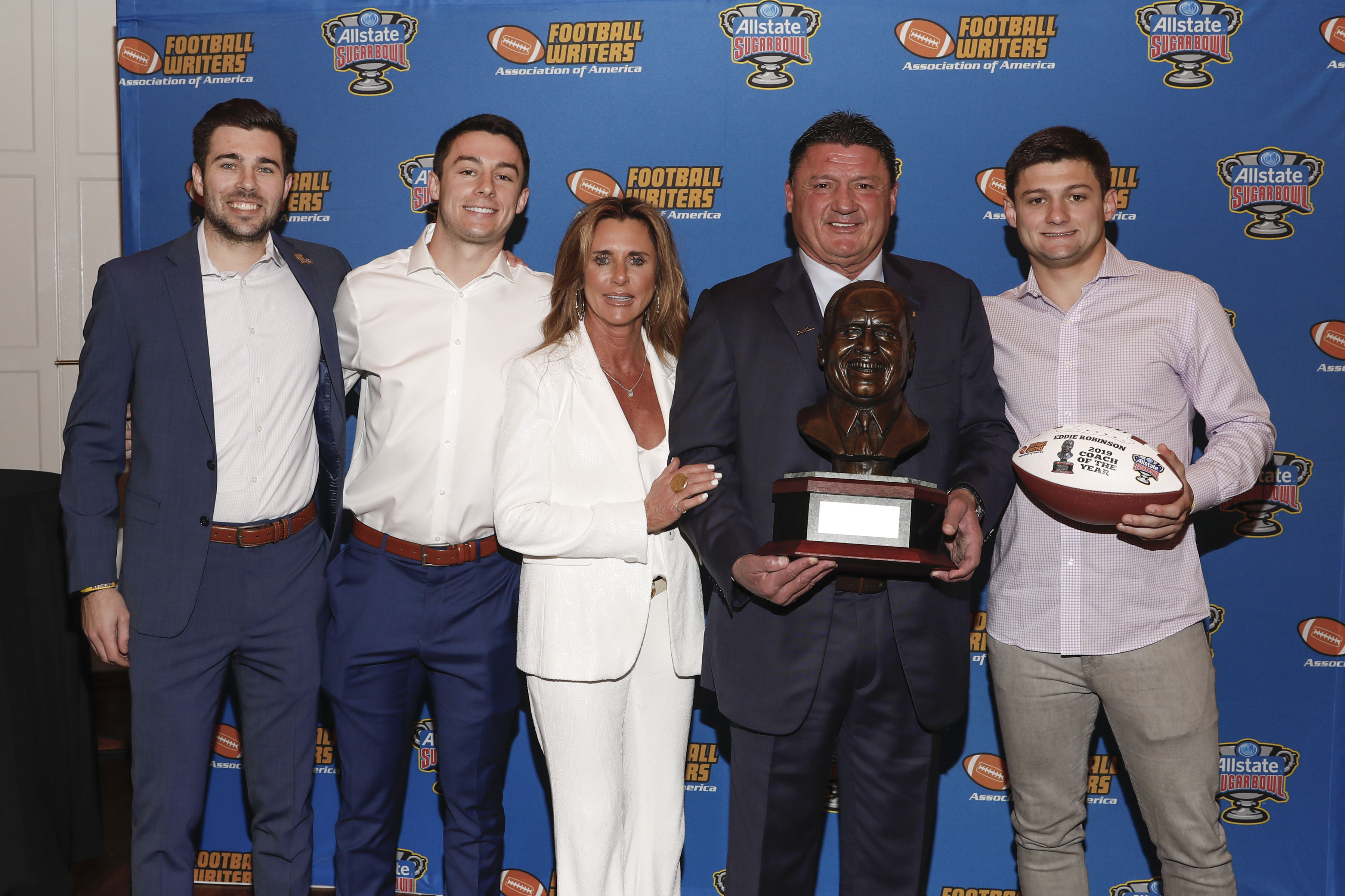 Eddie Robinson presentation 207 Published January 23, 2020 at 3600 × 2400 LSU Coach Ed Orgeron with the FWAA/Eddie Robinson Coach of the Year Award and his wife and sons. (Photo by Melissa Macatee)