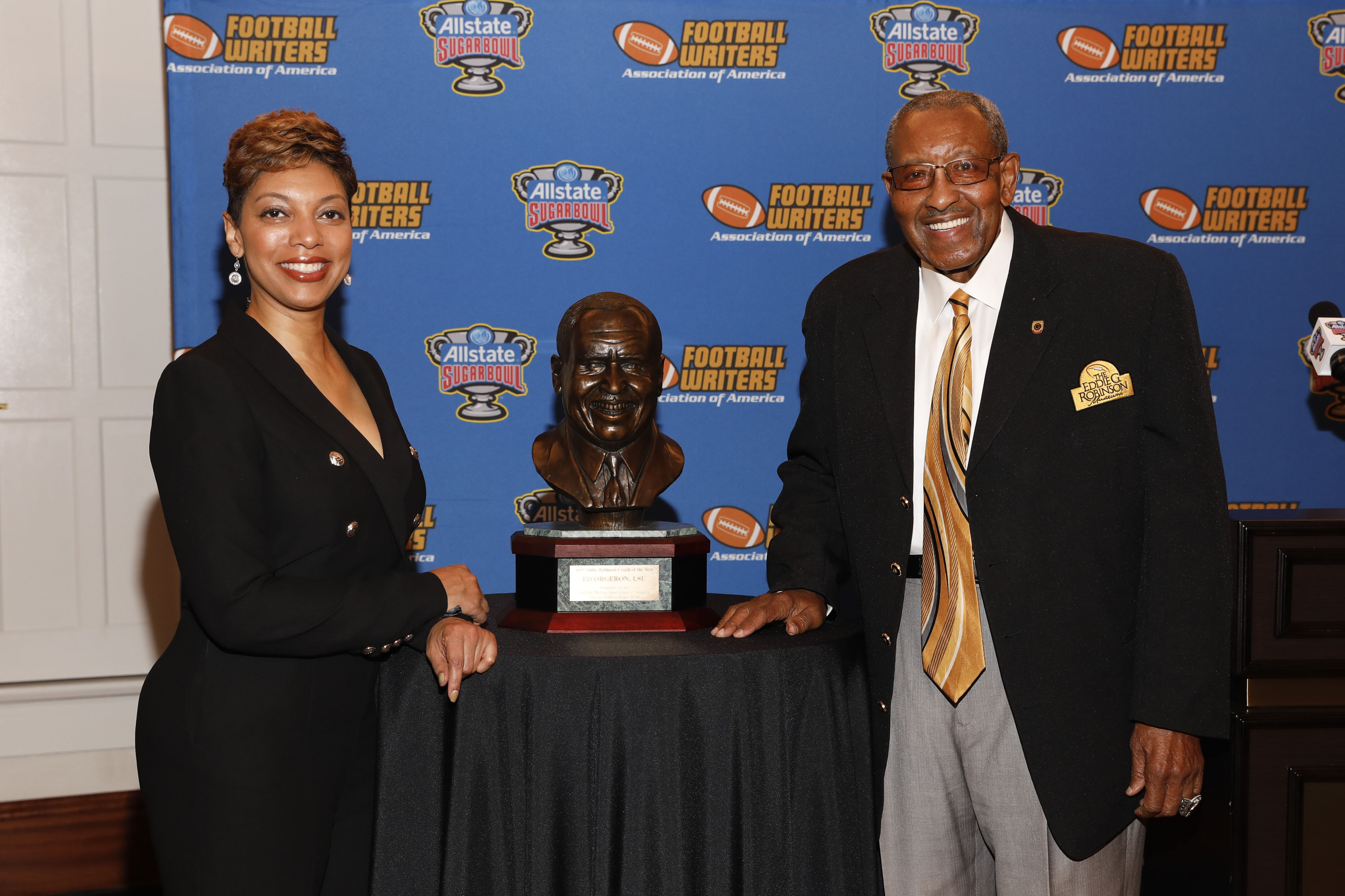 Eddie Robinson presentation 8 Published January 23, 2020 at 3600 × 2399 Charie Kirkland, granddaughter of former Grambling Coach Eddie Robinson, and Wilbert Ellis of the Eddie G. Robinson Museum in Grambling, La. (Photo by Melissa Macatee)