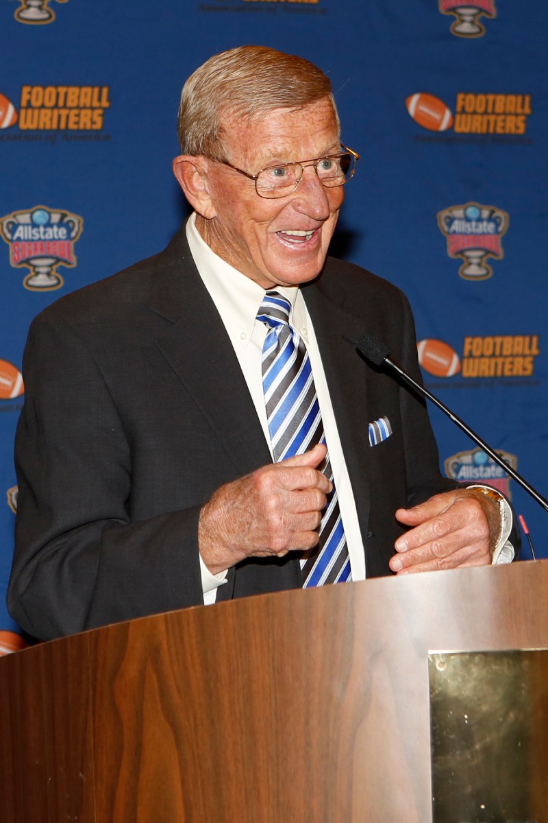 10 January 2015; The Football Writers Association of America and the Sugar Bowl host the annual Eddie Robinson Award dinner in Dallas, Texas. Two time recipient Lou Holz makes remarks before introducing Eddie Robinson III. Photo by Melissa Macatee.