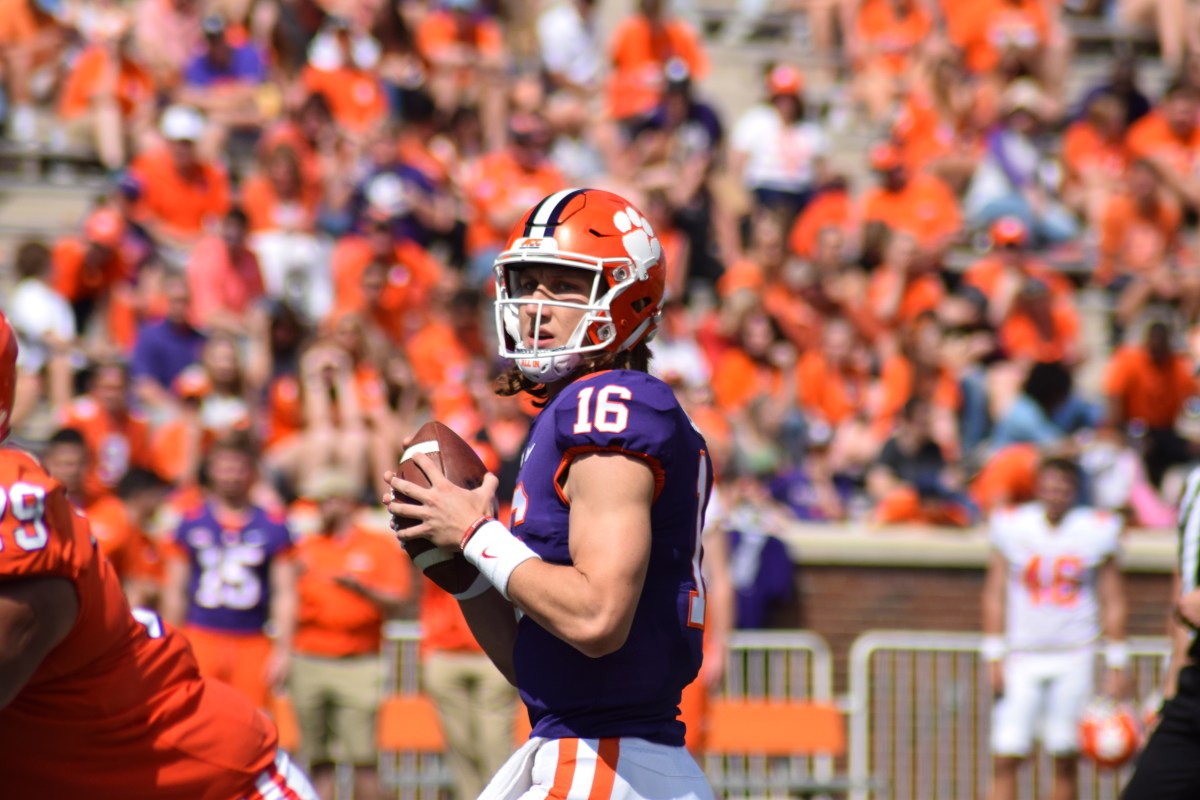 MikeGriffith_1389 red Published April 9, 2019 at 6000 × 4000 Clemson quarterback Trevor Lawrence, the first winner of the Shaun Alexander/FWAA Freshman of the Year Award, drops back to pass in Clemson’s 2019 spring game. Alexander honored Lawrence with the trophy at the game. Photo by Mike Griffith.