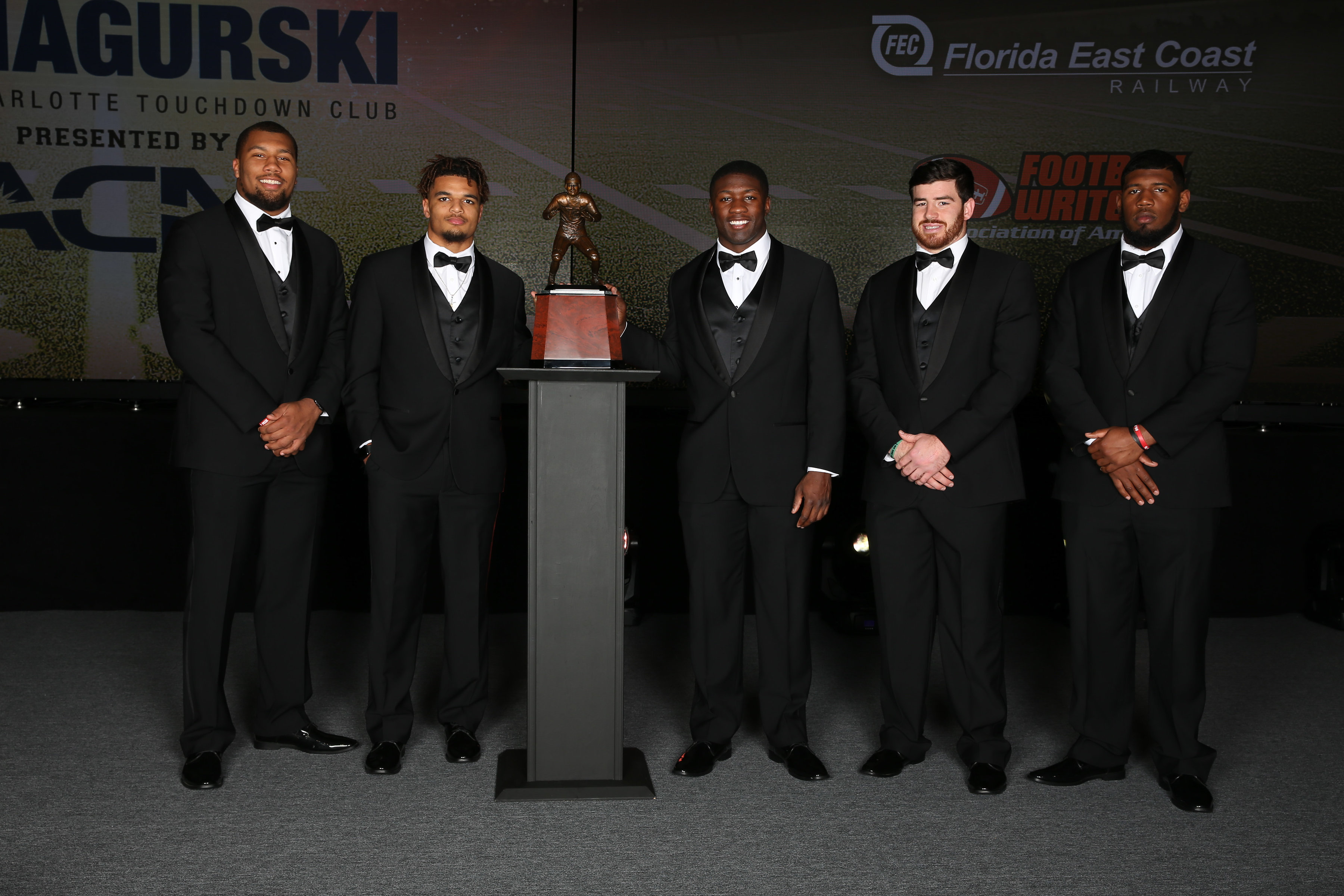 The five finalists for the 2017 Bronko Nagurski Award, left to right: Bradley Chubb of North Carolina State, Minkah Fitzpatrick of Alabama, Roquan Smith of Georgia, Josey Jewell of Iowa and Ed Oliver of the University of Houston. Photo by Michael Strauss.