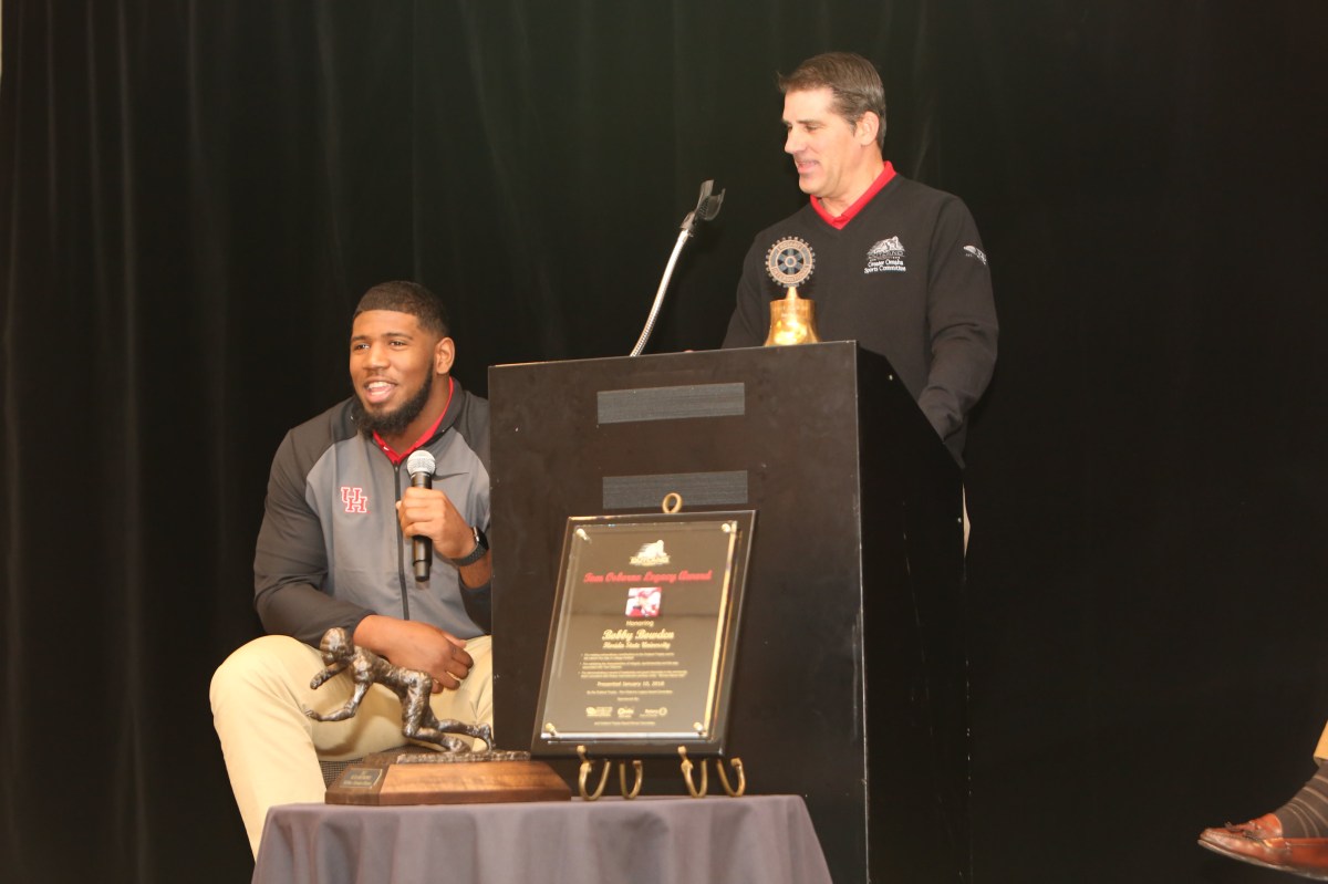 oliver and mancuso and awards Published January 20, 2018 at 4898 × 3265 Outland winner Ed Oliver takes a question while Bob Mancuso of the Greater Omaha Sports Committee looks on from the podium. The Outland Trophy and the Tom Osborne Legacy Award are in the foreground. C41Photography.