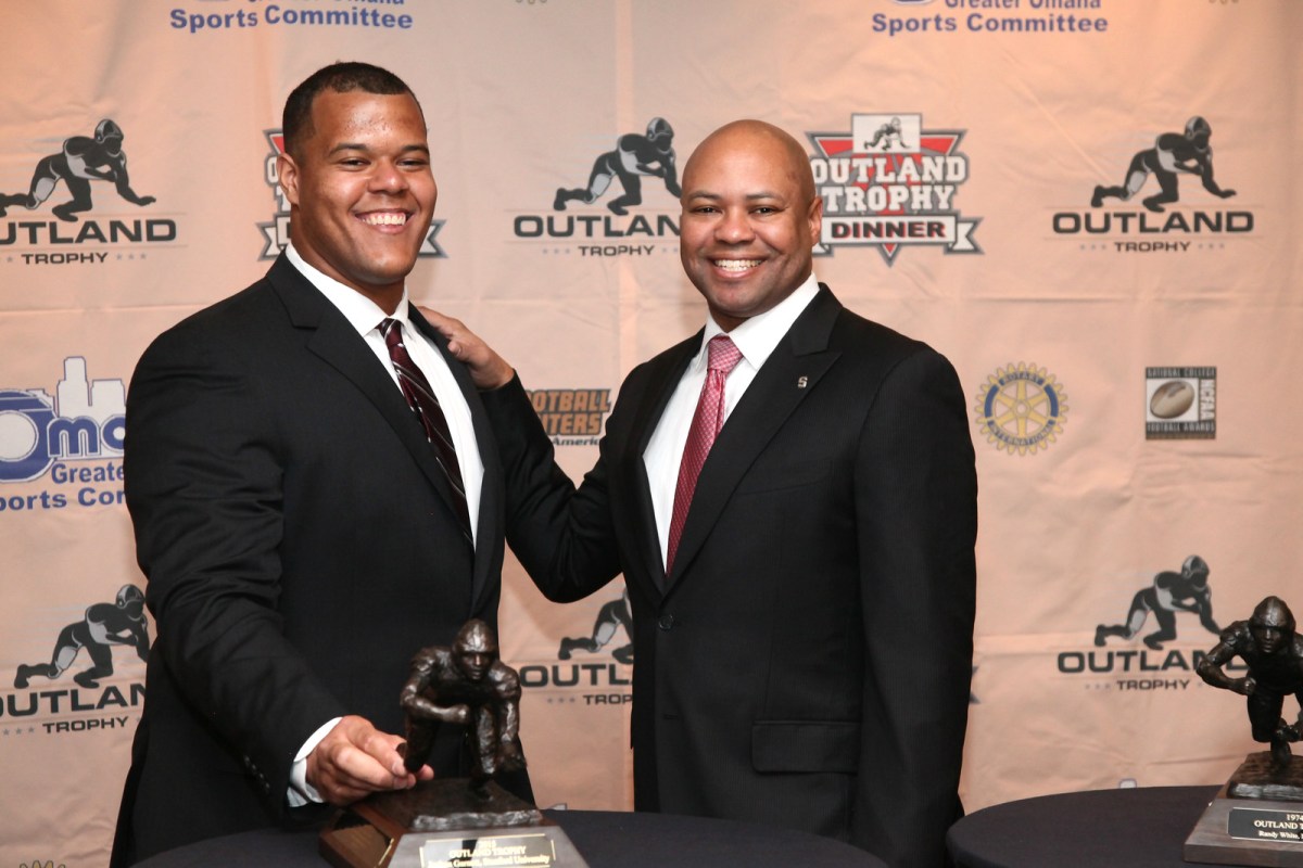 outland 102 Published January 22, 2016 at 1600 × 1067 2015 Outland Trophy winner Joshua Garnett of Stanford and his coach David Shaw. Photo provided by the Greater Omaha Sports Committee.