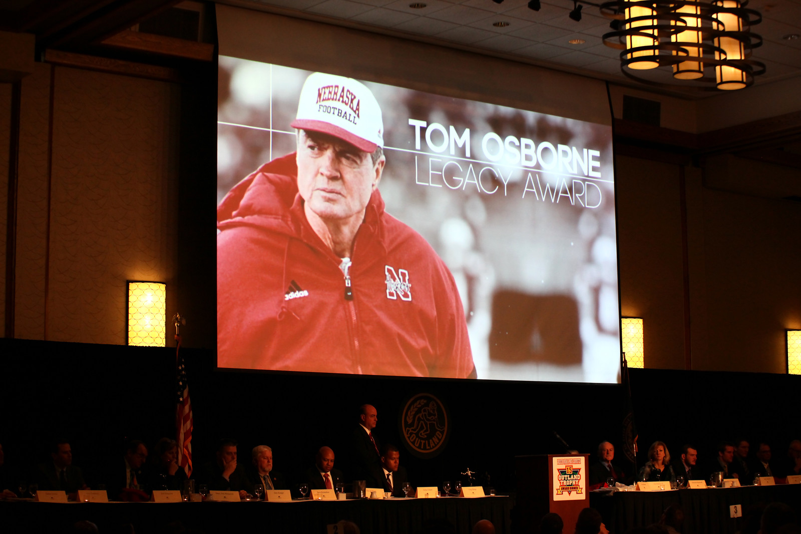outland 107 Published January 22, 2016 at 1600 × 1067 The Tom Osborne Legacy Award went to Jim Ridlon Sr., a former college and professional football player and the artist who sculpted the Outland Trophy. Photo provided by the Greater Omaha Sports Committee.