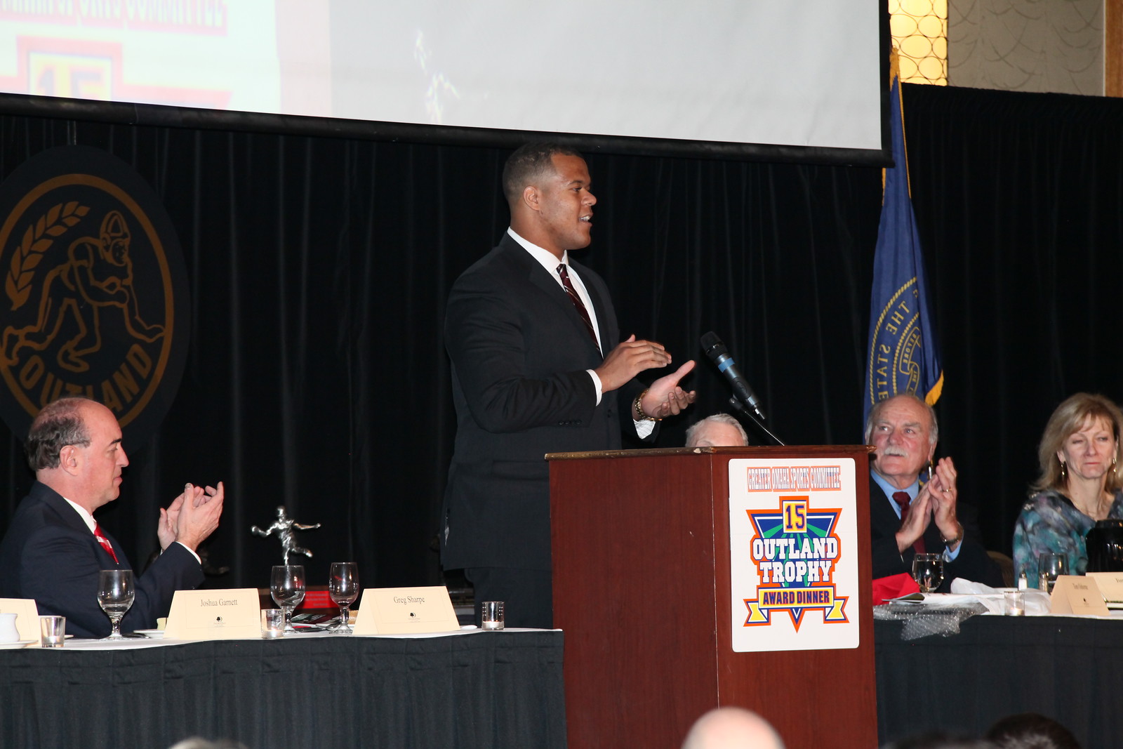 outland 109 Published January 22, 2016 at 1600 × 1067 2015 Outland Trophy winner Joshua Garnett of Stanford addresses the audience at the presentation banquet. Photo provided by the Greater Omaha Sports Committee.