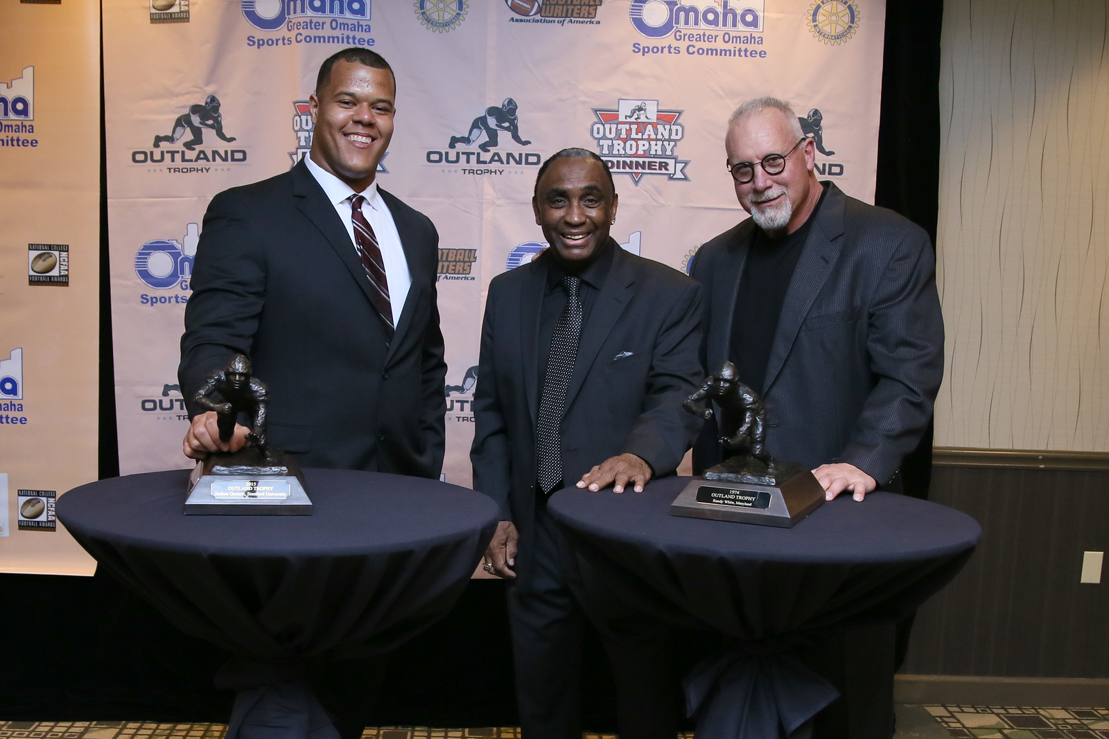 outland 110 Published January 22, 2016 at 1600 × 1067 2015 Outland Trophy winner Joshua Garnett of Stanford, former Nebraska star Johnny Rogers and 1974 Outland winner Randy White, who received his trophy at the banquet on Jan. 14 in Omaha. Photo provided by the Greater Omaha Sports Committee.