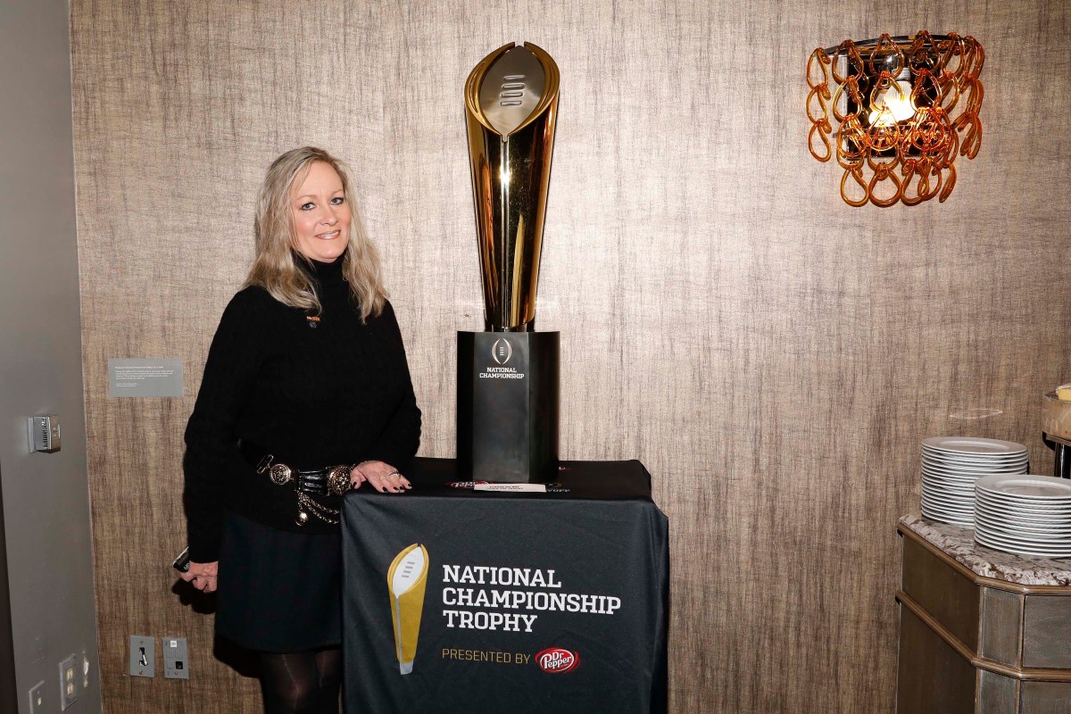 past13 Published January 21, 2019 at 3600 × 2400 FWAA’s Margaret Mason poses with College Football Playoff Championship Trophy. (Photo by Melissa Macatee)