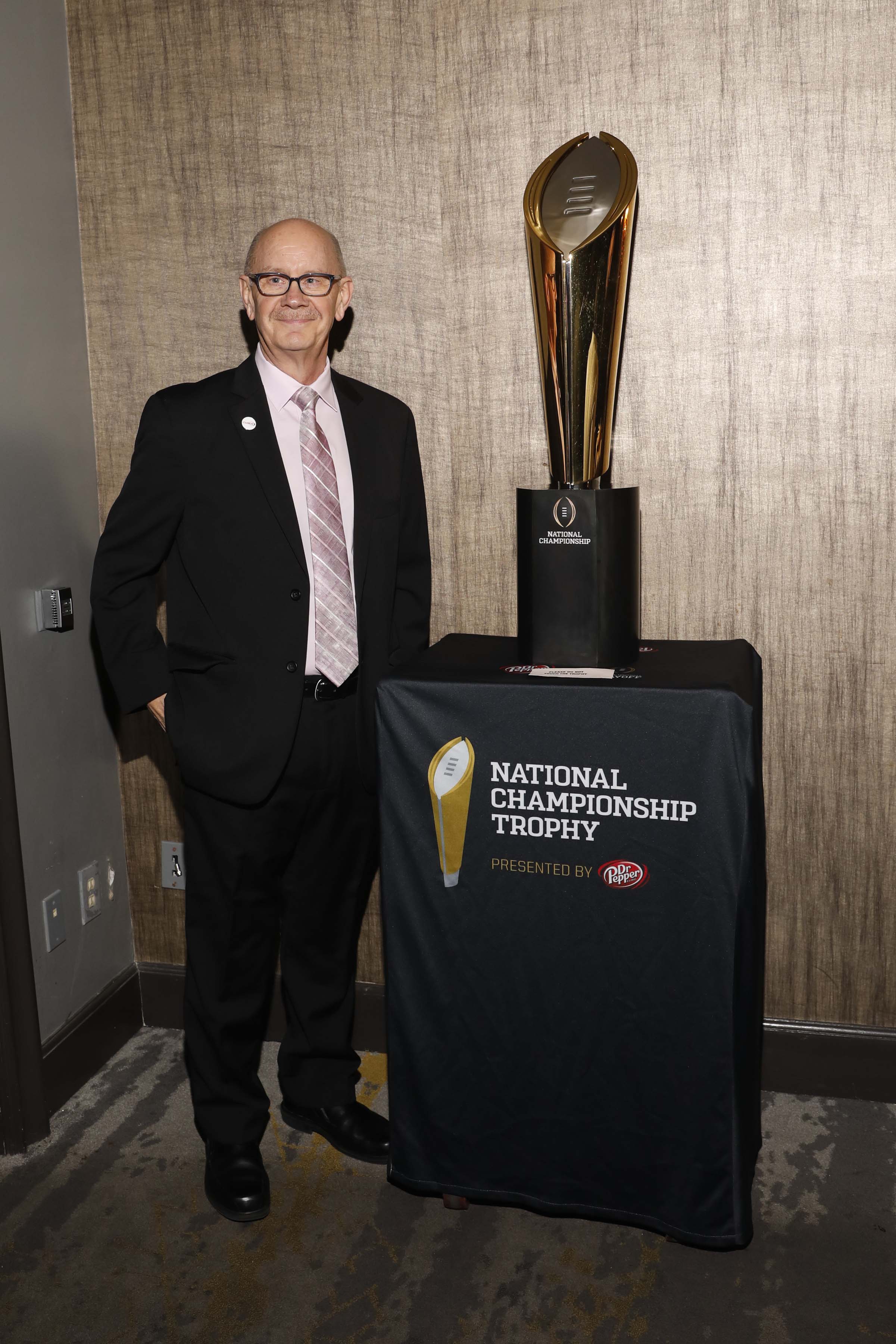 past16 Published January 21, 2019 at 2401 × 3600 CoSIDA’s Doug Vance hangs out with College Football Playoff’s Championship Trophy. (Photo by Melissa Macatee)