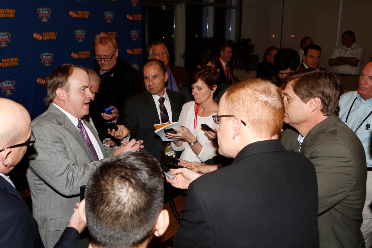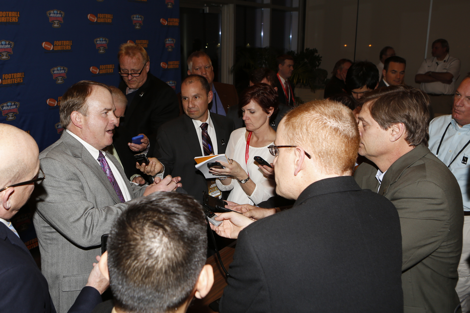Reporters surround TCU Coach Gary Patterson on Jan. 10, 2015, in Dallas, where Patterson received the FWAA Eddie Robinson Coach of the Year Award. (Melissa Macatee photo)